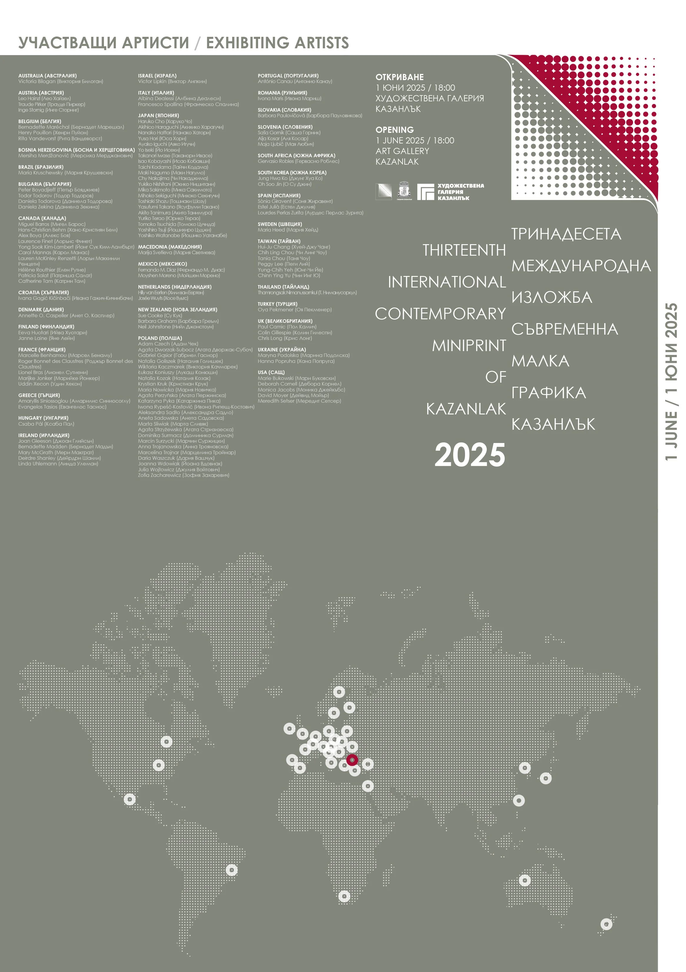 We wish to express our sincere gratitude to the 2025 international jury! Their commitment and contribution has allowed for a wide selection of varied and highly engaging work to take part in this edition, further corroborating Miniprint Kazanlak’s ambition to act as a forum for discussion and collaborative exchange between artists and art lovers for years to come!